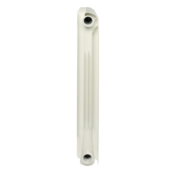 В отверстиях коллекторов выполняется трубная резьба размером 1 (с одной стороны правая, а с другой – левая). Резьба служит для соединения секций между собой в радиаторы различной длины с помощью стальных резьбовых ниппелей. Геометрия ниппельных соединений, а также параметры прокладок гарантируют надежную герметичность собранного радиатора. Наружная поверхность секции радиатора окрашена порошковой эмалью белого цвета (RAL 9010).