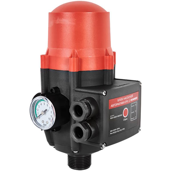Блок автоматики представляет собой комбинацию реле давления и реле протока. В корпусе свободно перемещается в вертикальном направлении втулка расхода с магнитом. Когда водоразбора нет, то втулка под действием собственного веса опускается, размыкая контакты геркона. При наличии протока втулка поднимается, замыкая контакты геркона. Мембрана уравновешена давлением жидкости снизу и силой упругости пружины сверху. Мембрана посредством штока жестко связана с втулкой давления, в которую интегрирован постоянный магнит. Когда давление жидкости уменьшается, то втулка перемещается вниз, замыкая контакты геркона. Данные о состоянии герконов передаются в электронный блок. Настройка давления срабатывания производится с помощью настроечного винта. При водоразборе или падении давления ниже настроечного значения, блок включает насос, обеспечивая подачу воды потребителю. Величину давления включения пользователь может регулировать самостоятельно. При прекращении водоразбора, блок выключает насос с задержкой в 8 секунд, тем самым, предохраняя систему от гидравлического удара. При отсутствии воды во всасывающей линии блок отключает насос, предохраняя насос от работы в режиме «сухого хода». Встроенный в блок автоматики манометр позволяет визуально контролировать величину давления рабочей среды на выходе из блока.