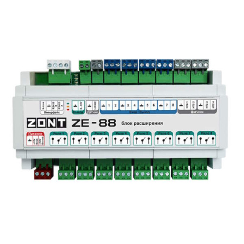 Блок расширения ZONT ZE-88 настраивается совместно с основным контроллером. При правильном подключении блок автоматически определяется в настройках основного контроллера, при этом в настройках отображается серийный номер устройства. При необходимости можно изменить имя блока, присваиваемое по умолчанию.