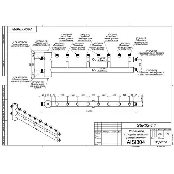 Гидрострелка с коллектором Прокситерм GSK 32-4.1 предназначена для устройства систем отопления с тремя потребителями тепла с различными параметрами расхода и температуры теплоносителя. Состоит из подающего и обратного коллекторов, расположенных друг над другом.