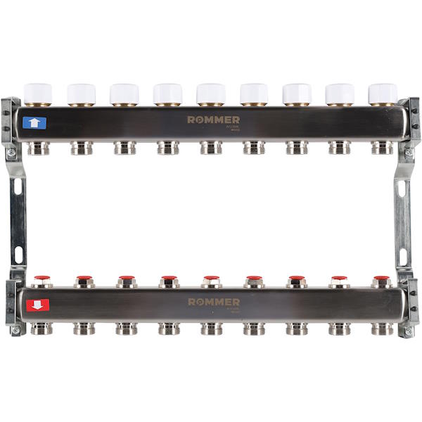 Коллектор ROMMER без расходомеров 9 выходов – предназначен для улучшения производительности систем отопления зданий, за счет равномерного распределения теплоносителя по контурам. Коллекторы могут использоваться как в домах индивидуальной застройки, так и в системах отопления многоквартирных жилых зданий, где требуется распределение потока теплоносителя между помещениями на этаже многоквартирного многоэтажного жилого или административного здания.