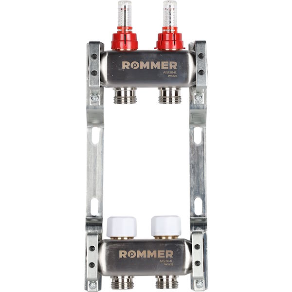 Коллектор ROMMER с расходомерами 2 выхода – предназначен для улучшения производительности систем отопления зданий, за счет равномерного распределения теплоносителя по контурам. Коллекторы могут использоваться как в домах индивидуальной застройки, так и в системах отопления многоквартирных жилых зданий, где требуется распределение потока теплоносителя между помещениями на этаже многоквартирного многоэтажного жилого или административного здания.
