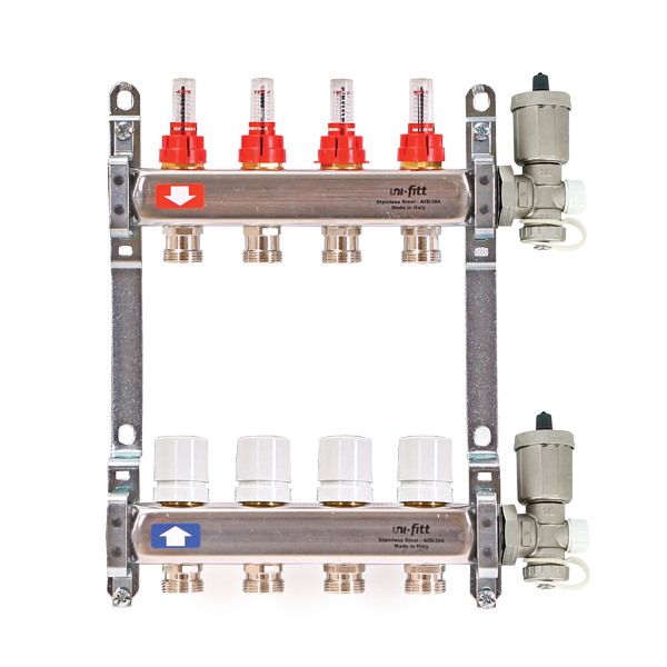 Коллектор Uni-Fitt 11 выходов с расходомерами и концевиками из нержавеющей стали предназначены для распределения и регулирования потоков теплоносителя в низко- или высокотемпературных системах отопления, такие как радиаторная сеть или теплые полы. Оснащены расходомерами на подающем коллекторе и термостатическими вентилями (с возможностью установки термоэлектрических приводов) на обратном коллекторе.