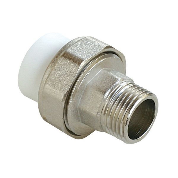 2. Комбинированный полипропиленовый фитинг. Закладная деталь изготовлена из латуни марки ЛС-59-2. Используется для соединения полипропиленовой трубы и элемента системы с резьбовым соединением. Латунные части производятся методом горячего штампования, пластиковые - методом литья под давлением.