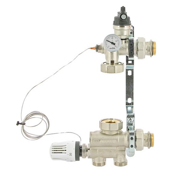 Комплектация насосно-смесительной группы Uni-Fitt : нижний гидравлический блок (со смесительным клапаном с байпасным и обратным клапаном). Верхний гидравлический блок (с автоматическим клапаном для удаления воздуха 1/2" , а также контрольным термометром от 0 до +80 градусов по Цельсию). Крепежная скоба для смесительного узла и термостатическая головка с погружным температурным датчиком.