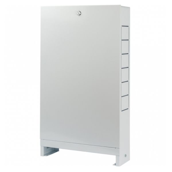 Шкаф распределительный STOUT наружный 13-16 выхода (ШРН-5) предназначается для размещения в них распределительных коллекторов и коллекторных блоков для систем отопления (радиаторной или напольной) с поквартирной разводкой. Шкаф выполнен из оцинкованной стали, окрашен порошковой краской RAL 9016 с предварительным нанесением фосфатной пленки для придания антикоррозионных свойств изделию. В боковых стенках корпуса шкафа выполнена перфорация, сегменты которой удаляются в любом удобном месте для подсоединения трубопроводов. Шкаф имеет регулировку по высоте до 40 мм за счет выдвижных ножек. Внутри шкафа установлены универсальные профильные крепления, позволяющие располагать оборудование по всей высоте и ширине шкафа. Шкаф оснащен внутренним замком.