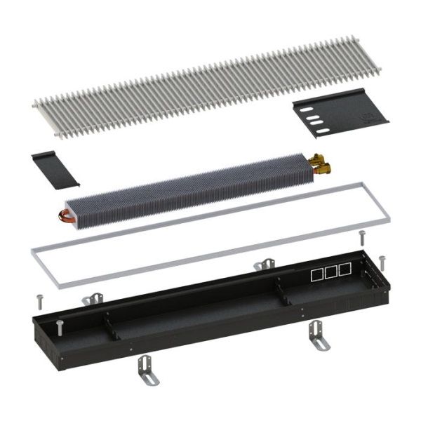 Данное оборудование выгодно отличается от других встраиваемых в пол конвекторов своей универсальностью, например если не правильно был подобран прибор по теплоотдаче, то есть возможностью установки в них вентиляторов для изменения типа конвекции с естественной на принудительную. Для этого в конструкции короба предусмотрены все соответствующие детали, а теплообменник смещен к краю освобождая место для вентиляторов.